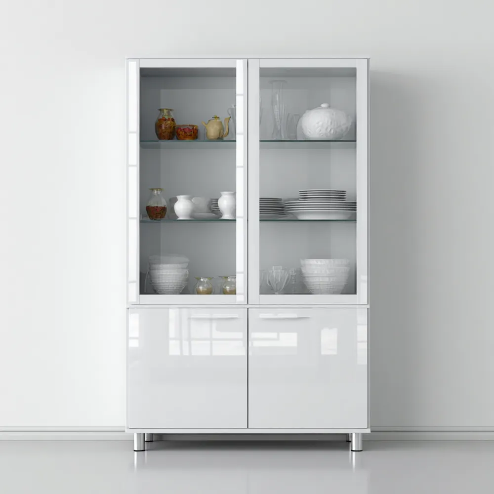 Fabriquée en bois de haute qualité avec une finition blanc brillant, cette armoire est dotée de portes vitrées pour un effet lumineux et spacieux. Les étagères en verre ajoutent une touche d'élégance.